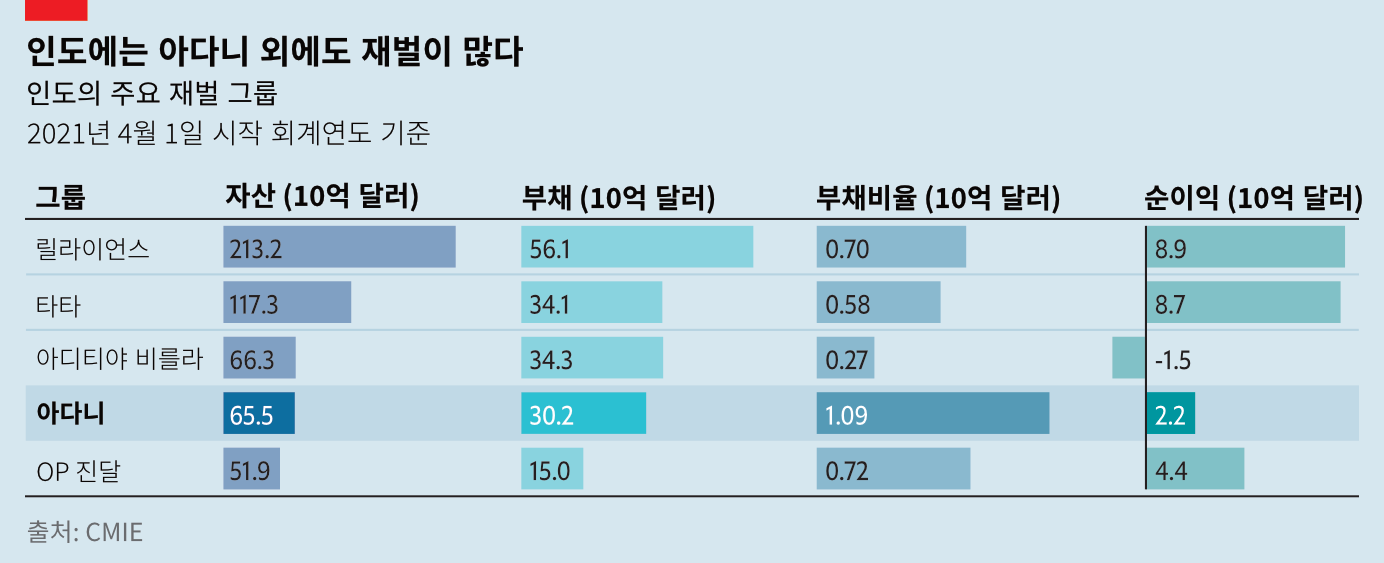 모디 총리에겐 인도의 경제를 성장시킬 역량이 있는 기업이 더 많이 필요할 것이다. 하지만 아다니 그룹 외에도 대규모 투자를 실시할 수 있는 기업은 많다. 2016년 릴라이언스 그룹은 중저가 4G 통신망 지오(Jio)를 출범해 인도의 무선통신 환경을 한 단계 도약시켰다. 작년에 타타 그룹은 빚에 허덕이던 국적항공사 에어인디아를 인수했는데 정부가 오랫동안 민영화하려고 애를 썼던 회사였다. (에어인디아는 과거 타타 그룹 소유였는데 1953년 국유화됐다.) 다른 인도 재벌 몇몇은 아다니 그룹처럼 자본 차입에 적극적인데도 불구하고 아다니 보다 규모도 크고, 재무상태도 건전하고 수익률도 높다.