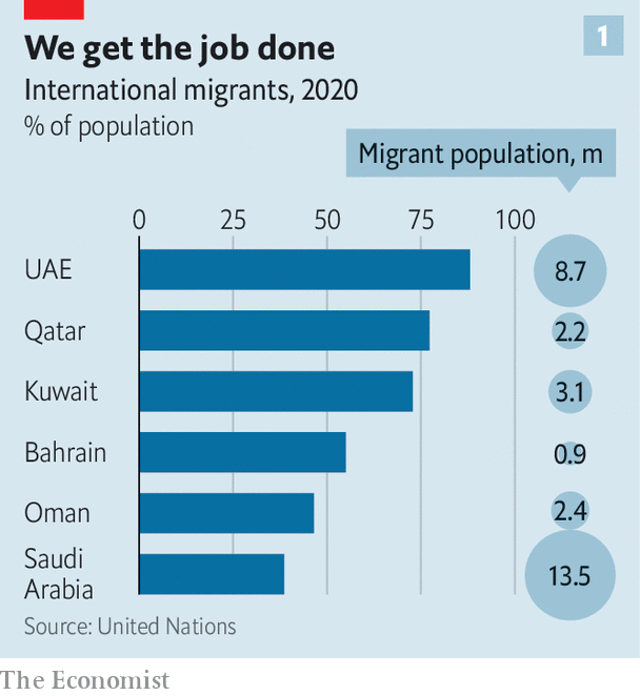 석유 왕국들의 모임인 걸프협력회의(GCC)의 6개 회원국은 수십 년 동안 비슷한 사회계약을 유지했다. 석유와 가스 수입으로 국고를 가득 채웠고 국민들은 보조금, 수당, 안락한 공공 부문 일자리의 형태로 혜택을 누렸다. 외국인들은 필요가 있는 동안만 와서 일했다. 두 집단(국민과 외국인)은 대부분 서로 무관한 삶을 살았다.