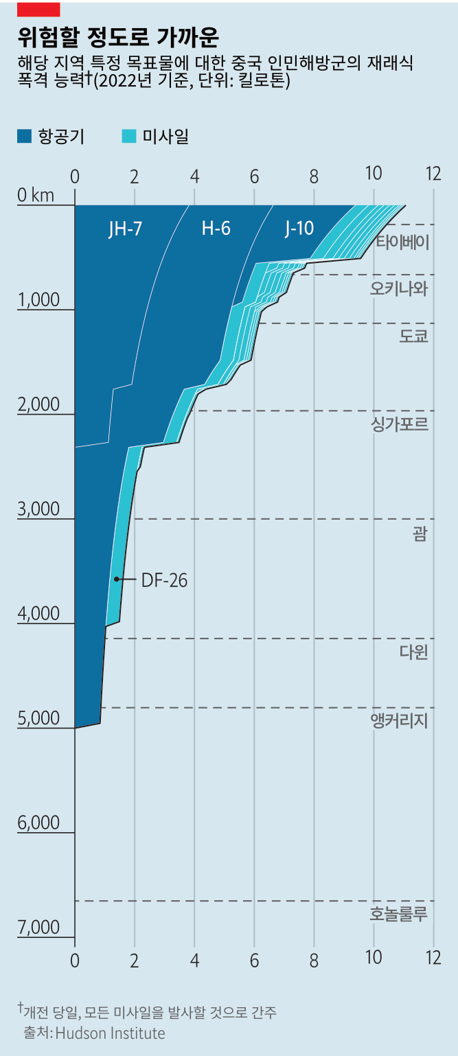 미국의 대만 방어 지원은 항공모함을 필두로 이루어지곤 했다. 1995년 중국이 대만 인근에 미사일을 발사했을 때 미국은 대만에 항모를 보냈고 1996년에 미사일을 연사했을 때도 그랬다. 그러나 그 이후로 중국은 미국의 군함과 항공기의 접근을 막기 위한 '반접근/지역거부(A2/AD)' 무기에 많은 투자를 했다. 태평양 깊숙이 타격 가능한 DF-26 미사일(지도2 참조)과 보다 요격이 어려운 신규 초음속 미사일도 여기에 속한다. 중국 해군은 이제 세계 최대 규모로, 접근하는 미국 함선을 공격할 수 있는 잠수함 함대도 보유하고 있다. 중국의 장거리 폭격기도 위협적이다. 대만 전쟁을 시뮬레이션한 비밀 워게임을 진행한 랜드연구소의 데이비드 오크매넉은 구식 미국 전략으로는 "패배로 이어진다"고 주장한다.