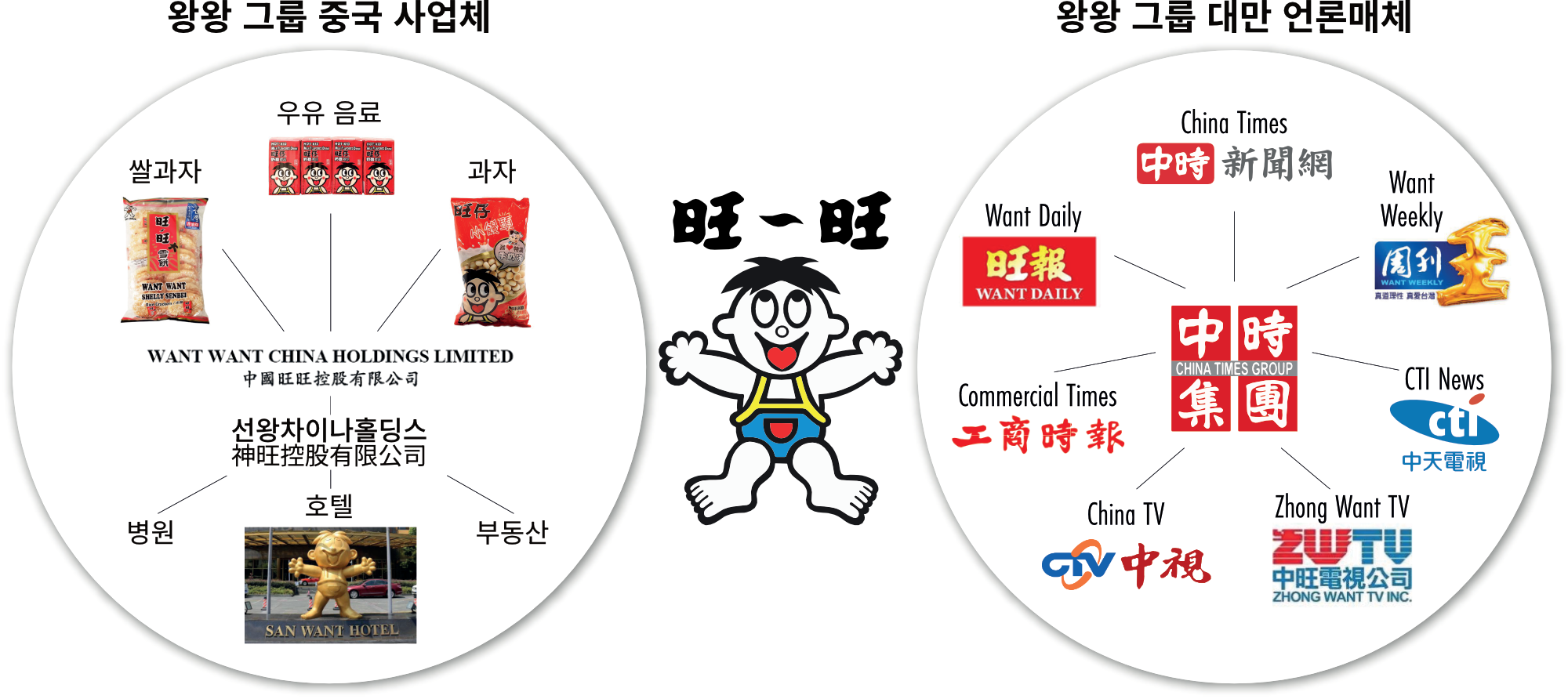 중국에서 과자와 우유 음료를 팔아 부를 축적한 차이옌밍은 변화하는 정치 지형 속에서 기회를 발견했다. 2008년에서 2009년 사이, 그는 공격적인 기업 인수에 나섰다. 차이나타임스(중국시보), CTV뉴스와 그 자매 채널 CTV를 인수했다. 그렇게 인수한 기업들을 모아 왕왕차이나타임스미디어그룹을 만든다.