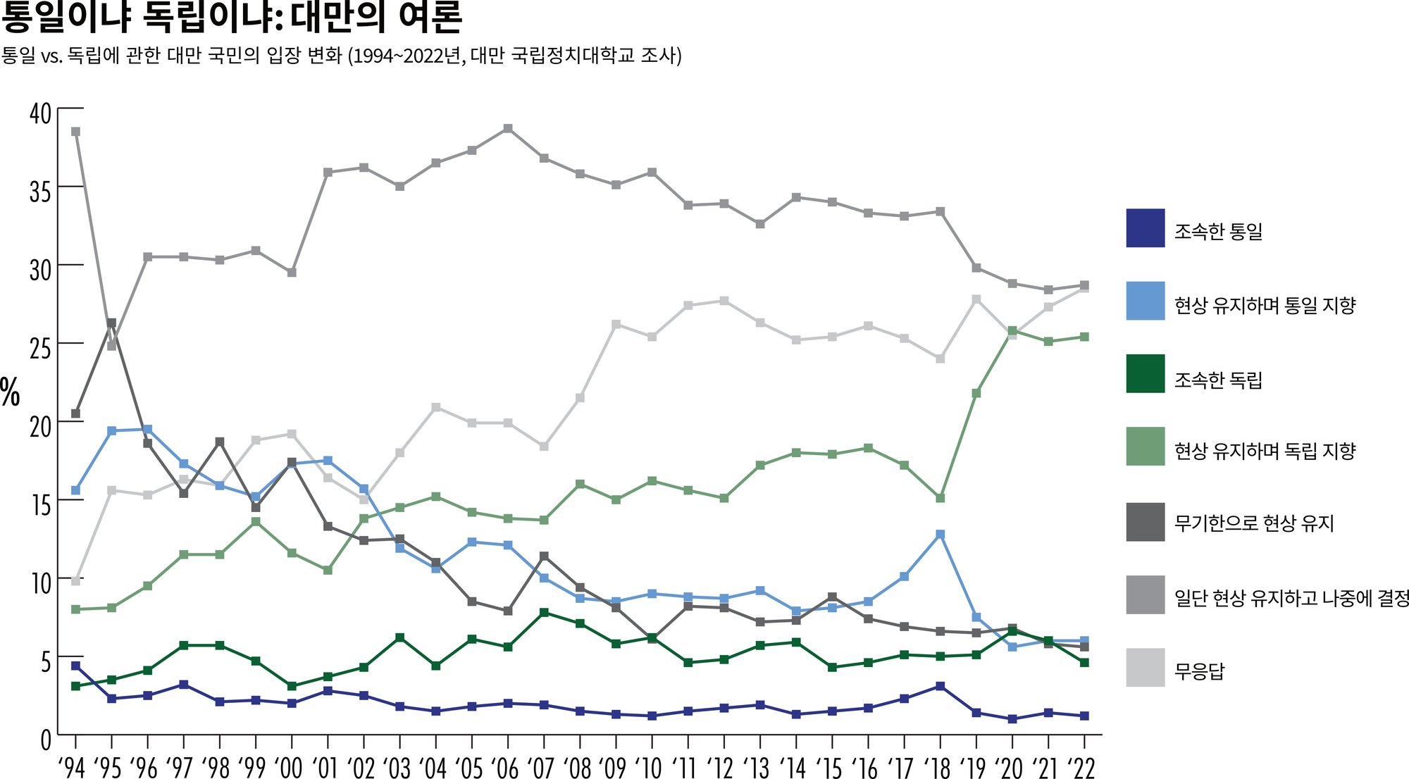 대만의 주권 문제에 대해서는 대만 내에 거국적인 공감이 형성돼 있다. 그러나 전문가들은 세계 속에서 대만의 위치를 어떻게 잡을 것인가에 대한 문제를 계속 미루는 행위, 이른바 '현상 유지'는 훌륭한 내러티브가 못 된다고 지적한다. 민진당과 국민당 모두 대만을 어느 방향으로 이끌 것인가에 대한 매력적인 비전을 창출하기 위해 애쓰고 있다.