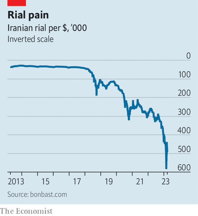 게다가 이란의 지도자들은 장기적인 제재를 견딜 수 있는 '저항 경제'를 구축했다고 믿고 있다. 폭락하는 리알화와 치솟는 인플레이션도 큰 걱정거리가 안된다. 이란 정권은 중국과 러시아가 이란을 떠받쳐 줄 것이라고 생각한다. 이란은 2021년 중국과 25년간 '전략적 파트너십'에 합의했으며 러시아-우크라이나 전쟁 중 러시아와의 관계를 강화했다. "그들은 서방에 '우리에겐 파트너가 있으니 당신들은 필요 없다'는 신호를 보내고 싶어 합니다." 비엔나 국제경제연구소의 고드시는 말한다.
