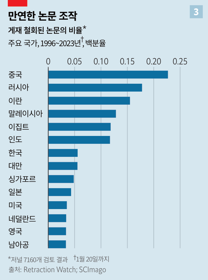 특히 중국에서 이런 문제가 크다. 중국 병원에서 최고의 직위를 얻기 위해 비현실적인 논문 게재량을 채워야 하는 경우가 많고 고급 저널에 논문을 게재하면 거액의 현금 보너스를 받기도 한다. 중국에서 논문 공장이 번성한 게 놀랍지 않은 이유다. 실제로 논문 공장과 연루돼 철회된 논문 거의 전부에 중국인 저자가 들어있다. 학술지에 제출된 논문 중 중국 학술 기관 소속 기고자가 1명 이상 포함된 논문은 약 5분의 1. 그런데 이 5분의 1에서 철회된 논문의 거의 절반이 나왔다.