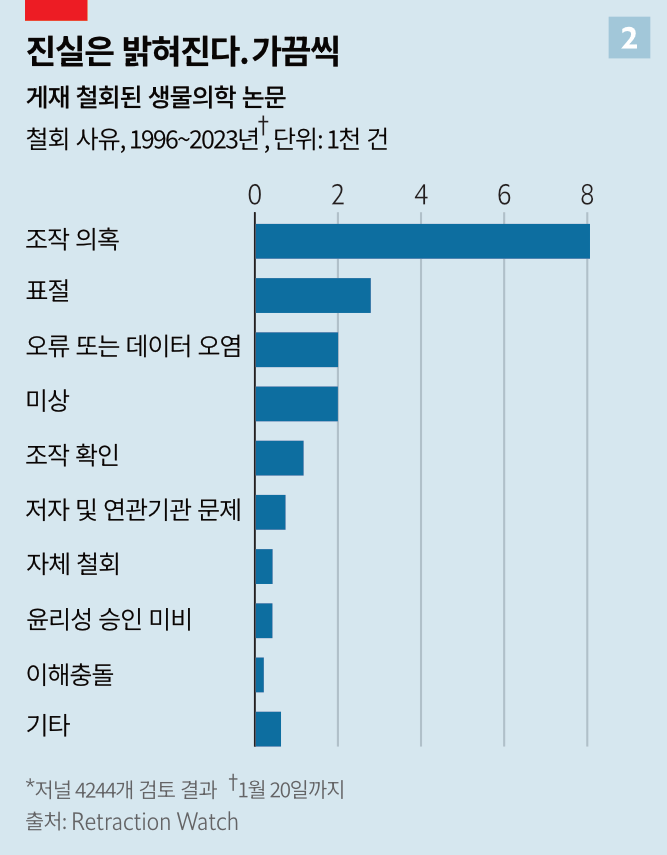 몰 박사 같은 탐정들의 노력으로, 부분 혹은 전체적으로 조작된 논문이 계속 발견되고 있다. 온라인 데이터베이스 '리트랙션 워치' 집계에 따르면 지금까지 생물의학 부문 논문 1만9000여 편이 철회됐다(그래프 1 참조). 그중 이 분야에서 2022년에 철회된 게 약 2600건으로, 2018년 대비 2배 이상 늘었다. 일부는 의도치 않은 실수로 철회됐지만, 어떤 형태로든 부정행위에 관여된 논문이 대다수였다(그래프 2 참조).