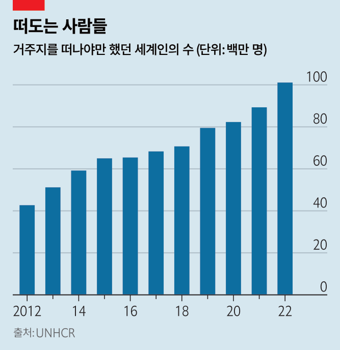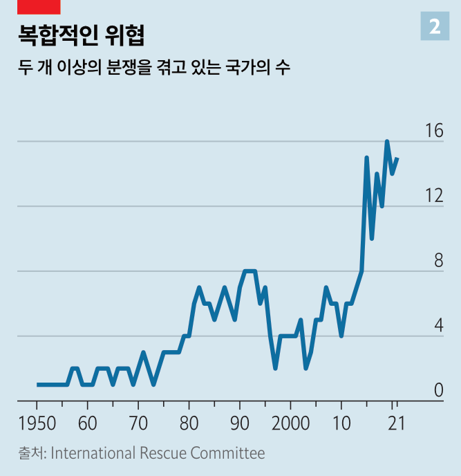 세인의 관심이 미국, 러시아, 중국의 강대국 경쟁에 쏠려 있는 동안 세계 다른 곳의 분쟁은 더욱 심각해지고 있다. 분쟁으로 살던 곳을 떠나 피난길에 오른 사람의 수는 지난 10년 동안 두 배로 늘어 현재 1억 명 정도로 추산된다. 세계적으로 빈곤은 줄었음에도 불구하고, 긴급구호를 필요로 하는 사람의 수는 2020년 이래 두 배로 늘어 현재 3억4000천만 명 가량이다. 국제구조위원회(IRC)는 이 중 80%가 분쟁으로 인한 것으로 추산한다.