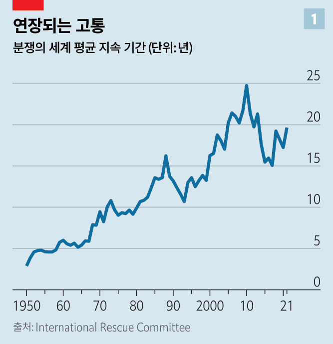전투는 가난한 지역을 더 빨리 가난하게 만든다. 통상 내전 5년은 1인당 소득을 5분의 1 감소시킨다는 게 크리스토퍼 블랫먼 시카고대 교수가 저서 <왜 우린 싸우는가>에서 밝힌 추산이다. 그래서 전쟁이 장기화된다는 건 더 우려스러운 일이다(그래프 1 참조). 1980년대 중반에는 분쟁이 평균적으로 13년 가량 지속됐으나 2021년에는 거의 20년 가량 지속됐다.