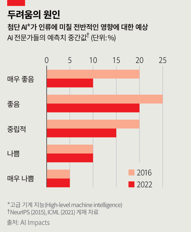 한편 더 큰 염려를 갖는 연구자도 있다. 위너의 글에 나왔던 '(과잉)일치 문제'(alignment problems)가 그중 하나로, 괴테의 마법 빗자루처럼 AI가 사용자 설정 목표에 몰두한 나머지 그 과정에서 의도치 않게 해를 끼칠 수 있다는 것. 이와 관련한 가장 대표적 사례로는 2003년 철학자 닉 보스트롬이 제시한 사고 실험인 '종이클립 생산 극대화'가 있다. AI에 종이 클립을 최대한 많이 생산하라는 지시를 내려 보는 것이다. '이디오 사방3'인 AI는 지구를 종이클립 공장으로 덮어야 극대화를 이루는 방법이라 여기고 그 목표 달성 과정에서 인류를 멸종시키는 등 어떤 조치든 취할 수도 있다. 누군가는 더글러스 애덤스4 소설에 나올 법한 이야기라고 치부할 수도 있다. 하지만 AI임팩츠의 여론조사가 보여주듯, AI 연구자들은 디지털 초지능의 행동에 대해 걱정하지 않는 건 안일하다고 생각한다.