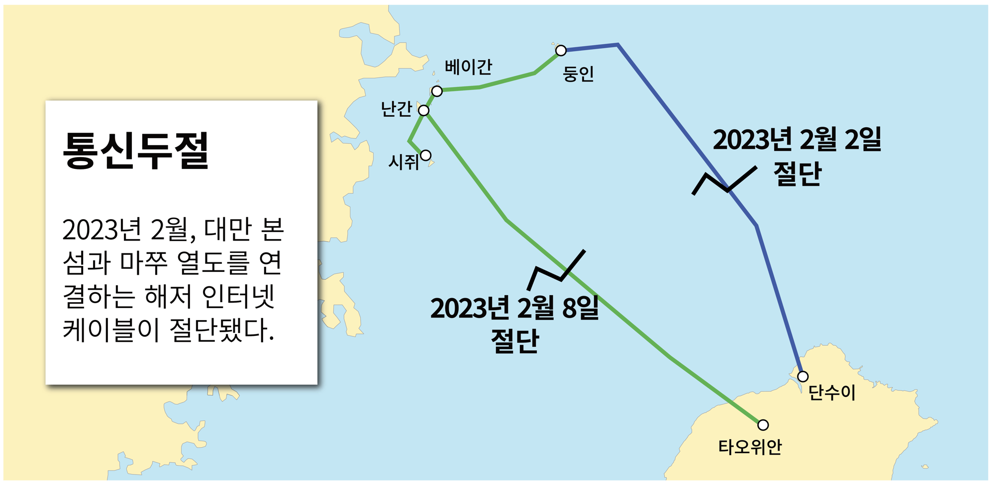 마쭈 열도에 인터넷 서비스가 재개된 것은 3월 31일이었다. 대만 정부가 해저케이블 수리 선박을 파견했다. 대만 정부가 나서는 게 처음은 아니었다. 마지막도 아닐 것이다. 대만 민진당의 마쭈 열도 지구당 사무실의 리원이 입수한 자료에 따르면, 마쭈 열도는 지난 5년간 케이블 절단사태를 27차례 겪었고, 그 수리비가 총 830만달러(약 110억원)에 달한다.