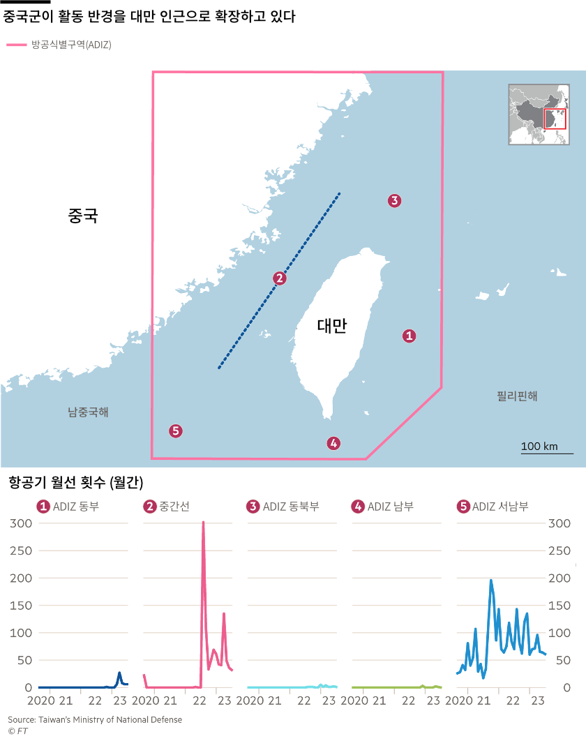 대만이 방공식별구역(ADIZ) 내 중국군 활동에 대한 데이터를 처음 공개하기 시작한 2020년 9월 이후, 중국 인민해방군이 대만의 방공식별구역을 침범한 월별 건수는 69건에서 올해 7월 139건으로 급증했다.