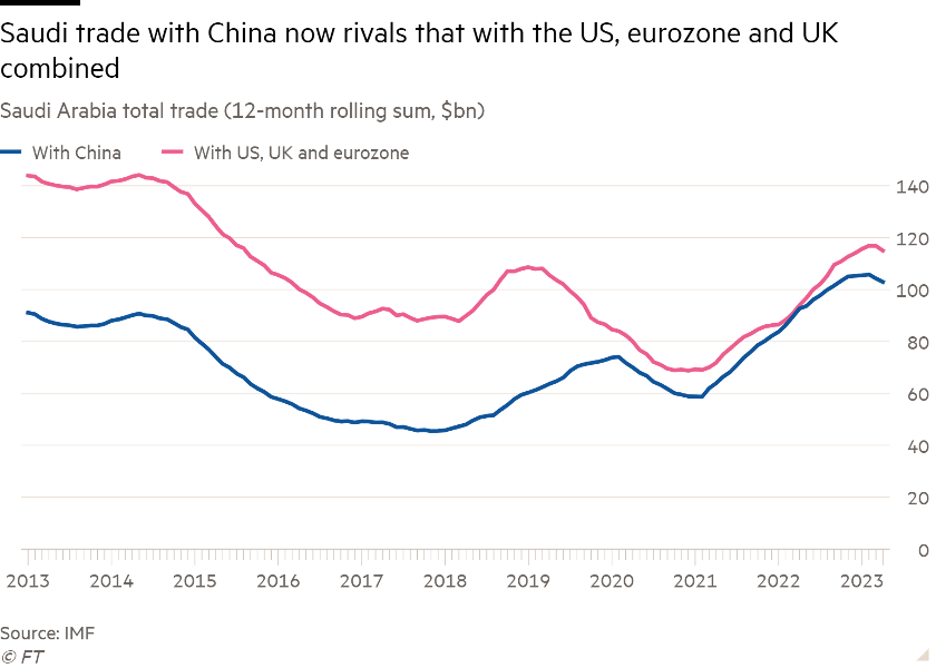 런던소재 아시아하우스 보고서에 따르면, 2021년 사우디는 중국과 8170억 달러의 무역액을 찍으며 잠시 미국, 영국, 유로권 국가들 모두와의 무역액을 초과했었다.