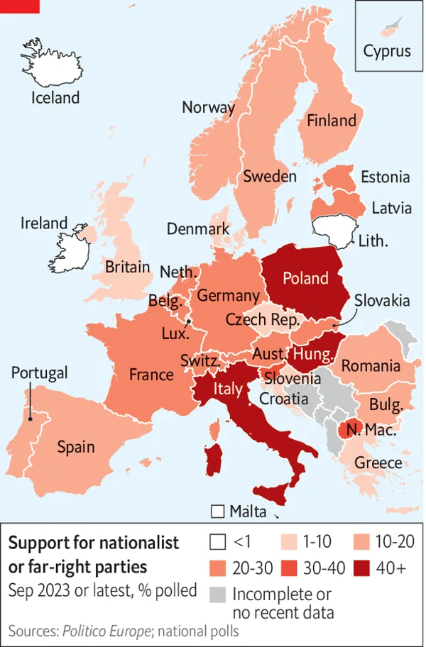 새로운 역사들은 계속 쓰일 것 같다. 강경 우파 정당들은 내년 유럽의회 선거에서 선전이 예상된다. '이탈리아의 형제들'의 당수이자 이탈리아의 총리인 조르자 멜로니는 유럽의회내 중도우파 연합인 '유럽인들의 당'(EPP)에게 강경 우파인 유럽 보수연합, 개혁연합(ECR)과 제휴할 것을 설득하고 있다. 멜로니는 개혁연합을 이끌고 있다. 이것이 성사되면 유럽연합 전체의 입법을 포퓰리즘 방향으로 돌릴 것이다. 한편, 프랑스에서는 대통령선거때마다 강경 우파의 성적이 좋아지고 있다. 지난 두 번의 대통령선거에서 결선까지 올랐던 마린 르펜은 2027년에 승리할 가능성이 있다.