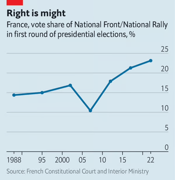 프랑스의 국민연합은 더 이상 프랑스가 유럽연합과 유로권을 탈퇴할 것을 주장하진 않는다. 물론 아직도 말로는 유럽연합에 반대하지만, 구체적인 반(反)유럽연합 정책은 제시하지 않는다. 이렇게 급진적인 정책에서 한발 뺀 것은 아마도 집권을 위해 지지기반을 확대하려는 의도가 있었을 것이다. 그리고 르펜이 집권을 하게 되더라도 그는 프랑스 대통령직이 가지는 엄청난 권한에도 불구하고 자신의 정책을 실행에 옮기는데 어려움을 겪게 될 것이다. 현 대통령인 마크롱의 경우, 작년 재선 선거운동 기간동안 미리 국가연금 개혁을 이야기 해놨는데도 막상 실행에 옮기려 하니 엄청난 저항에 부딪히게 되었다.