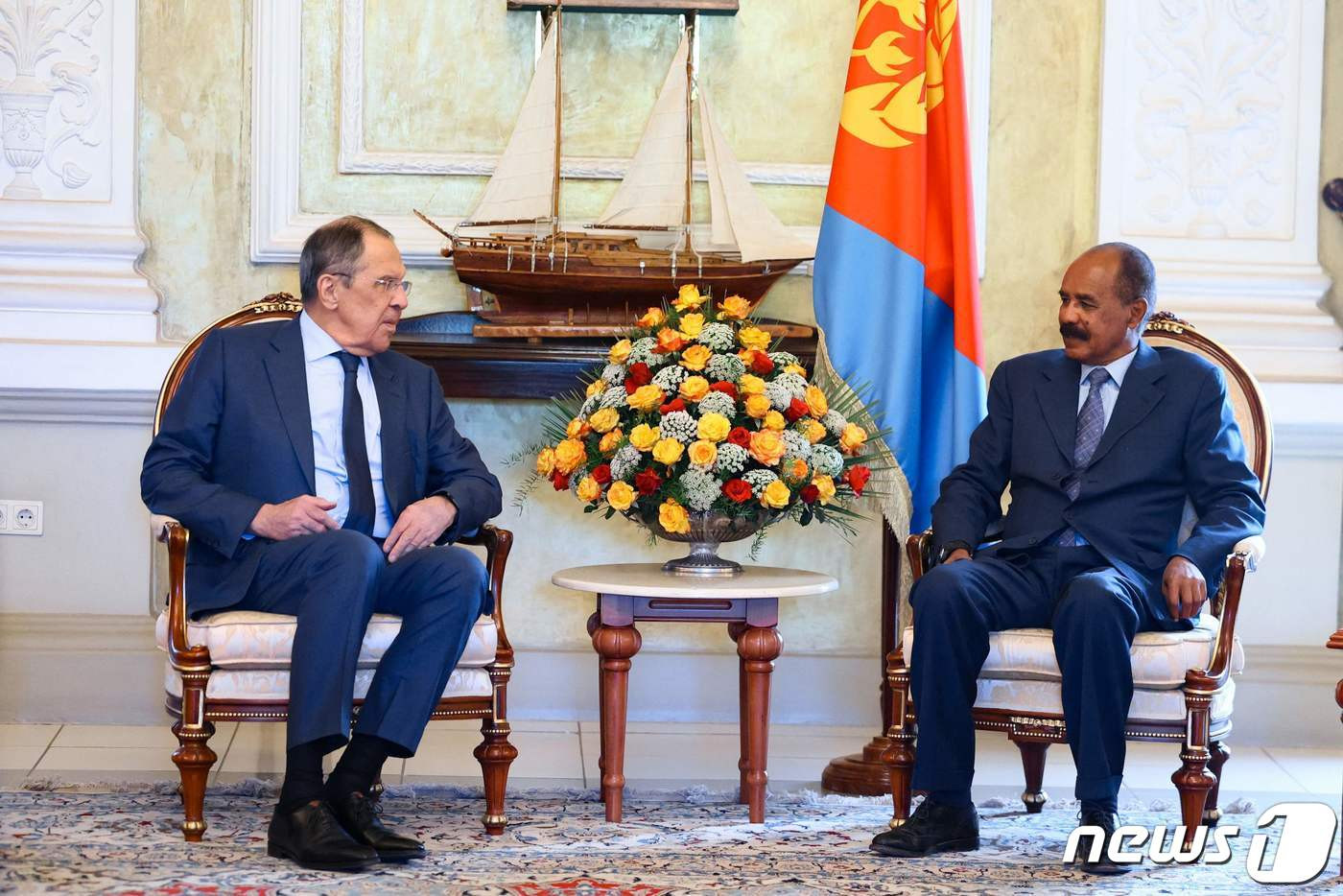 (아스마라 AFP=뉴스1) 우동명 기자 = 세르게이 라브로프 러시아 외무장관이 26일 (현지시간) 아프리카 순방 중 에리트레아 아스마라를 방문해 이사이아스 아페웨르키 대통령과 만나고 있다. ⓒ AFP=뉴스1 Copyright ? 뉴스1. All rights reserved. 무단 전재 및 재배포 금지.