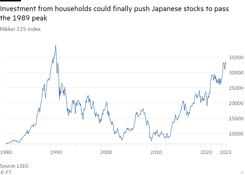일본 정부는 여러 차례 가계저축을 투자로 유도하기 위해 시도했지만 수년간 실패했다. 하지만 이번에는 전례 없는 유인책을 마련했다. 2024년 1월부터 '소액투자비과세제도1 少額投資非課?制度 '(NISA)가 대폭 확대되어 개인의 주식 투자에 대해 평생 면세 혜택을 제공할 예정이다. 또한 연간 납입한도를 120만엔에서 360만엔으로, 누적 납입한도를 600만엔에서 1800만엔으로 상향 조정했다.