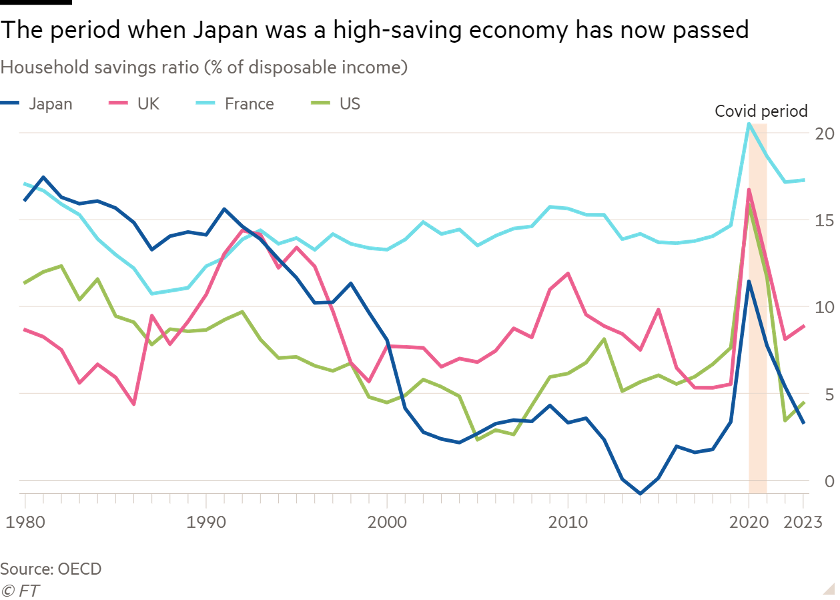 "일본 가계의 높은 저축률은 이미 옛날 이야기가 된지 오래입니다." '일본 경제의 미래를 위한 경쟁The Contest for Japan's Economic Future'의 저자 리처드 캐츠Richard Katz는 말한다. "대신 사람들은 정체된 소득에서 최대한 많은 부분을 소비함으로써 소비를 유지하고 있죠."