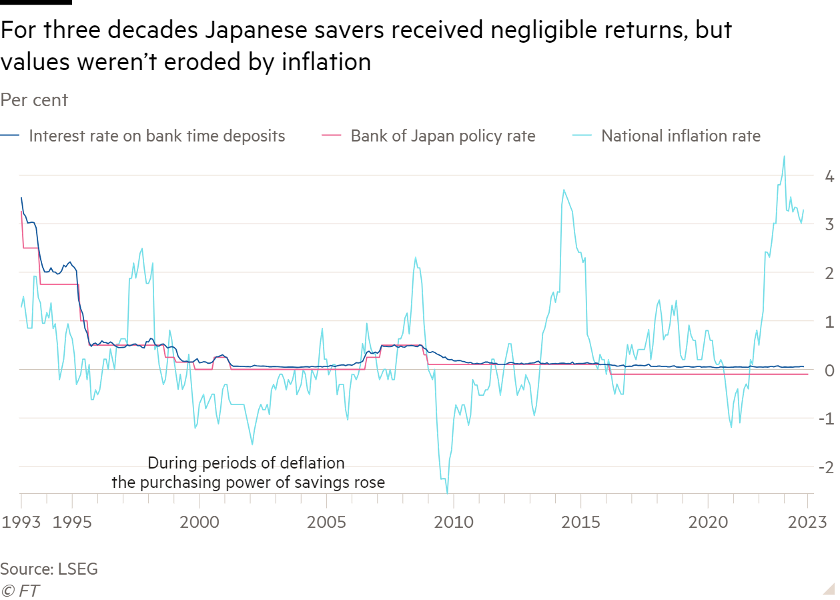 1990년대 후반부터 시작된 일본 중앙은행의 오랜 초저금리 실험으로 인해 와타나베 부인이 저축으로 얻을 수 있는 수익은 없었다. 하지만 기업들이 가격 인상을 자제하는 한 재산이 크게 줄어드는 일은 없었다.