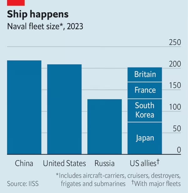 아마도 그럴 것 같다. 하지만 해양을 차지하기 위한 글로벌 경쟁에서 게릴라식 습격만으로는 충분하지 않다. 게다가 더 크고, 더 잘 무장하고, 더 비싼 군함에 대한 필요성으로 인해 군함의 수가 줄어들고 있다. 한때 전 세계 바다를 지배했던 영국 해군은 곧 보잘 것 없는 16척 구성의 프리깃함과 구축함 함대로 전락할 것이다. 다른 함정들을 포함해 총 70척에 불과하게 된다. 반면, 중국 해군은 2022-23년 1년 동안에만 약 30척의 함정이 증가했으며, 이 중 15척은 미 국방부가 '주요 수상 전투함'으로 분류한 함정이다. 미 해군 산하의 해군정보국이 작년에 제작한 슬라이드에 따르면 중국은 2035년 경 미국보다 50-55% 더 많은 군함을 보유할 것으로 예상된다.