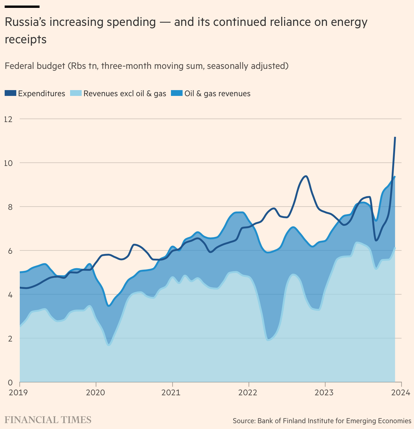 2023년 러시아의 에너지 수출은 8조 8000억 루블에 달했는데, 이는 2022년의 기록적인 실적에 비해 약 4분의1 감소했지만 지난 10년간의 평균을 상회하는 수치다. 그럼에도 불구하고 러시아 정부는 수입을 창출하기 위해 불규칙한 방법, 즉 서방 기업들이 러시아를 떠날 때 지불해야 하는 '자발적 기부금' 같은 일회성 세금과 부과금 등에 점점 더 의존해야 했다.