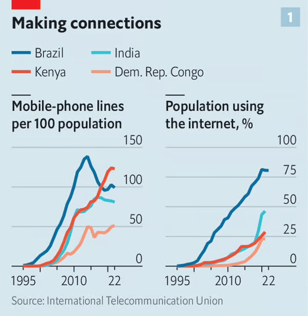 25년 전 한 이코노미스트 특파원이 콩고에서 휴대폰을 구입했다. 휴대폰을 사용하는데 매일 평범한 현지인이 몇 달 동안 벌어야 하는 돈이 들었다. 전화기는 벽돌 반 개 정도로 무거웠고 유용성은 일반전화보다 조금 낫다고 할 정도였다. 콩고에는 내각 장관과 재벌을 제외하고는 사실상 아무도 휴대폰이 없었기 때문에 전화할 상대도 많지 않았다. 당시만 해도 휴대폰은 세계 최빈국 사람들 대부분의 삶에 눈에 띄는 변화를 가져다주지 못했다.