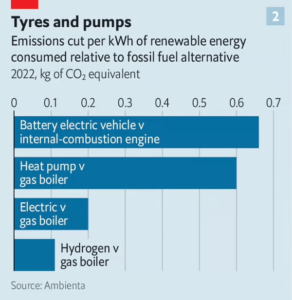 이러한 히트펌프는 200°C 미만의 열을 필요로 하는 광범위한 제조업 공정을 전기화하여 화석연료를 사용하는 건조기, 스틸, 오븐, 보일러를 대체할 수 있다. 전기를 사용하여 히트펌프를 가동하는 것이 천연가스를 사용하는 보일러로 난방하는 것보다 몇 배 더 효율적일 수 있다. 반면 수소를 사용하는 것은 효율이 보다 떨어진다. 친환경 전기로 물 분자를 분해하여 수소를 만들면(그린수소) 탄소배출은 없지만 처음에 사용한 에너지의 최소 20%가 손실되기 때문이다(차트 2 참조).