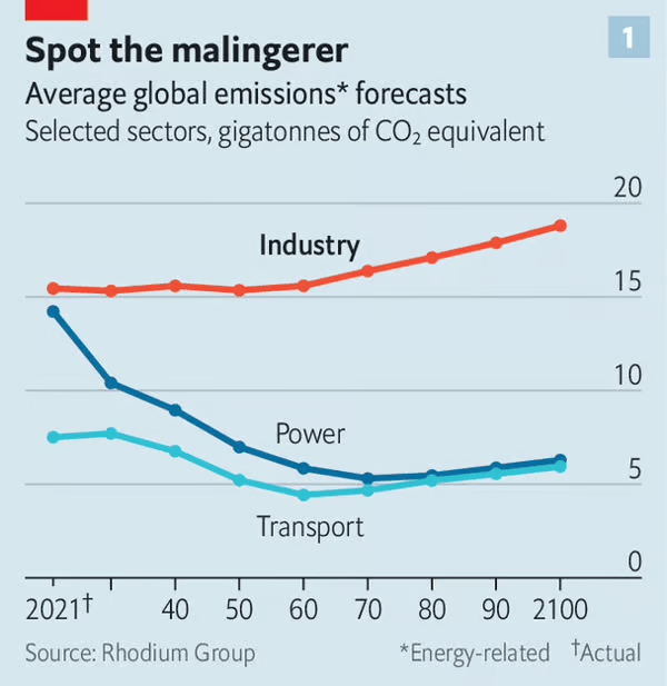 국제에너지기구(IEA)에 따르면 제조업은 전 세계 에너지의 3분의1을 소비하며 그 중 열 발생이 4분의3을 차지한다. 그 열의 무려 90%가 화석연료를 태워서 만들어진다. 이 모든 것으로 인해 제조업은 발전이나 운송 부문보다 더 큰 온실가스 배출원이다. 게다가 발전으로 인한 이산화탄소 배출량은 정점에 도달한 것으로 보이며 전기차가 계속 보급되면 운송 부문의 탄소 배출량도 곧 증가세를 멈출 수 있는 반면, 제조업 부문의 배출량은 무한정 증가할 것으로 예상된다(차트 1 참조).