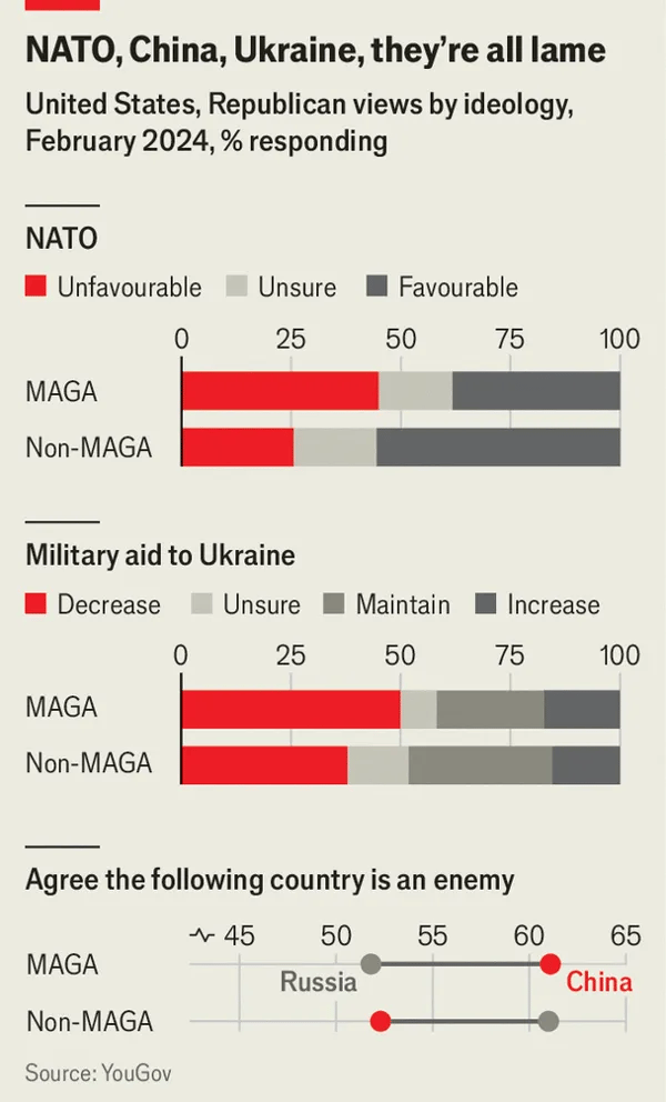 '미국 우선'은 사실상 '유럽은 맨나중'을 의미하게 되었으며, 이는 자제론자와 우선순위론자 모두가 공유하는 견해이다. YouGov 여론조사에 따르면 트럼프주의적인 '미국을 다시 위대하게 만들기'(MAGA, '마가') 공화당원들은 나토(NATO: 북대서양조약기구)에 대해 호의적이기보다는 부정적으로 생각하는 것으로 나타났다. 다른 공화당원들 사이에서는 패턴이 반대다. 마찬가지로, '마가' 공화당원들은 러시아를 다른 공화당원보다 덜 "적"으로 간주한다(차트 참조).