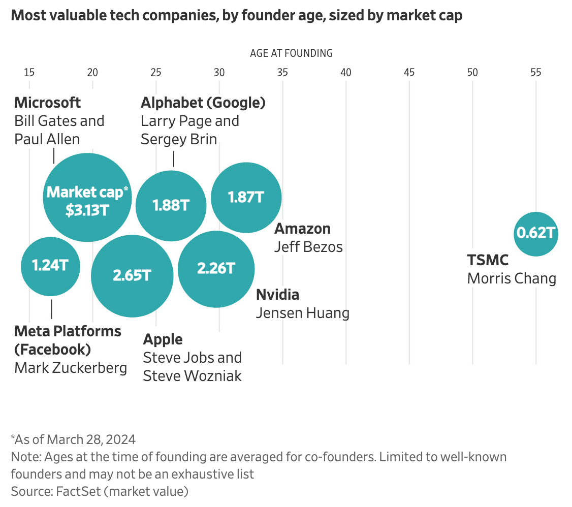 오늘날 세계에서 높은 가치를 지닌 테크 기업들은 놀라울 정도로 젊은 기업가들이 설립했다. 빌 게이츠는 19세, 스티브 잡스는 21세, 제프 베이조스와 젠슨 황은 30세에 기숙사, 차고, 식당에서 창업했다.