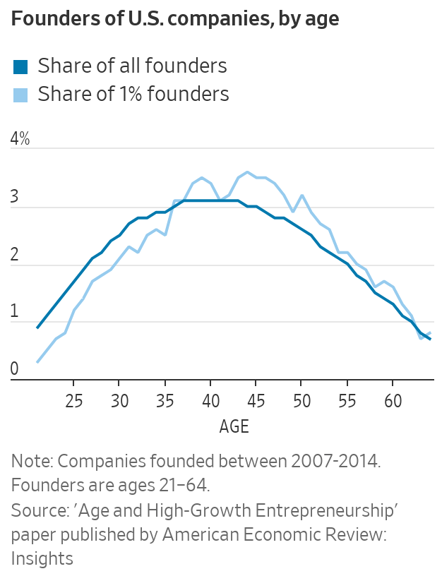 회사 설립 당시 이들 기업가의 평균 나이는 41.9세였다. 가장 빠르게 성장하는 기업의 경우 창업자의 평균 연령은 45세였다. 경제학자들은 또한 50대 창업자가 30대 창업자보다 큰 성공을 거둘 확률이 거의 2배나 높다는 것을 확인했고, 성공 가능성이 가장 낮은 창업자는 20대 초반이라는 것도 확인했다. 모든 증거는 그들을 직관에 반하는 결론으로 이끌었다.