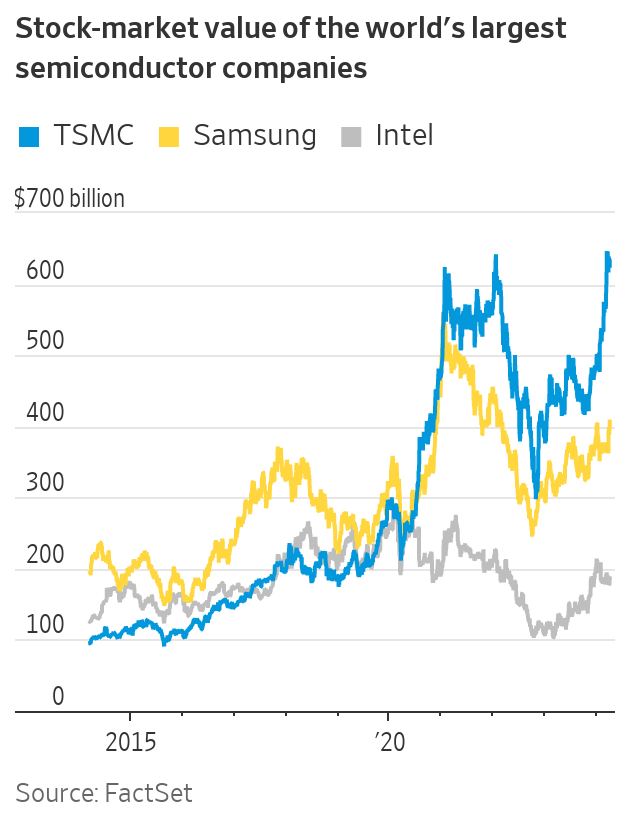 오늘날 수백 개가 넘는 TSMC의 고객사 중에는 TSMC 보다 가치가 높은 극소수의 회사인 애플과 엔비디아도 있다. TSMC는 애플의 아이폰, 아이패드, 맥 컴퓨터용 칩을 제조하는데 애플은 TSMC 총매출의 4분의1을 차지한다. 엔비디아는 종종 칩메이커로 불리지만 사실 칩을 직접 만들지 않는다. TSMC가 만든다.