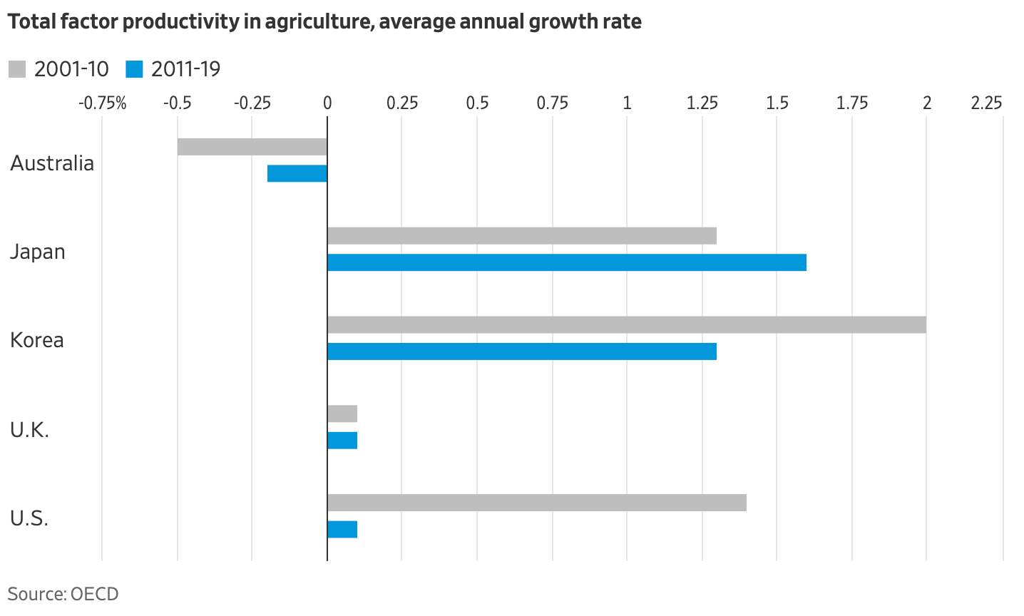 최근 몇 년 동안 선진국 전반에 걸쳐 노동생산성 증가는 부진했다. 미국과 영국의 농업 분야에서 생산성은 10년 이상 정체 상태다. 이민 정책이 더 엄격한 일본과 한국에서는 생산성이 연간 약 1.5% 증가(OECD 자료)했다.
