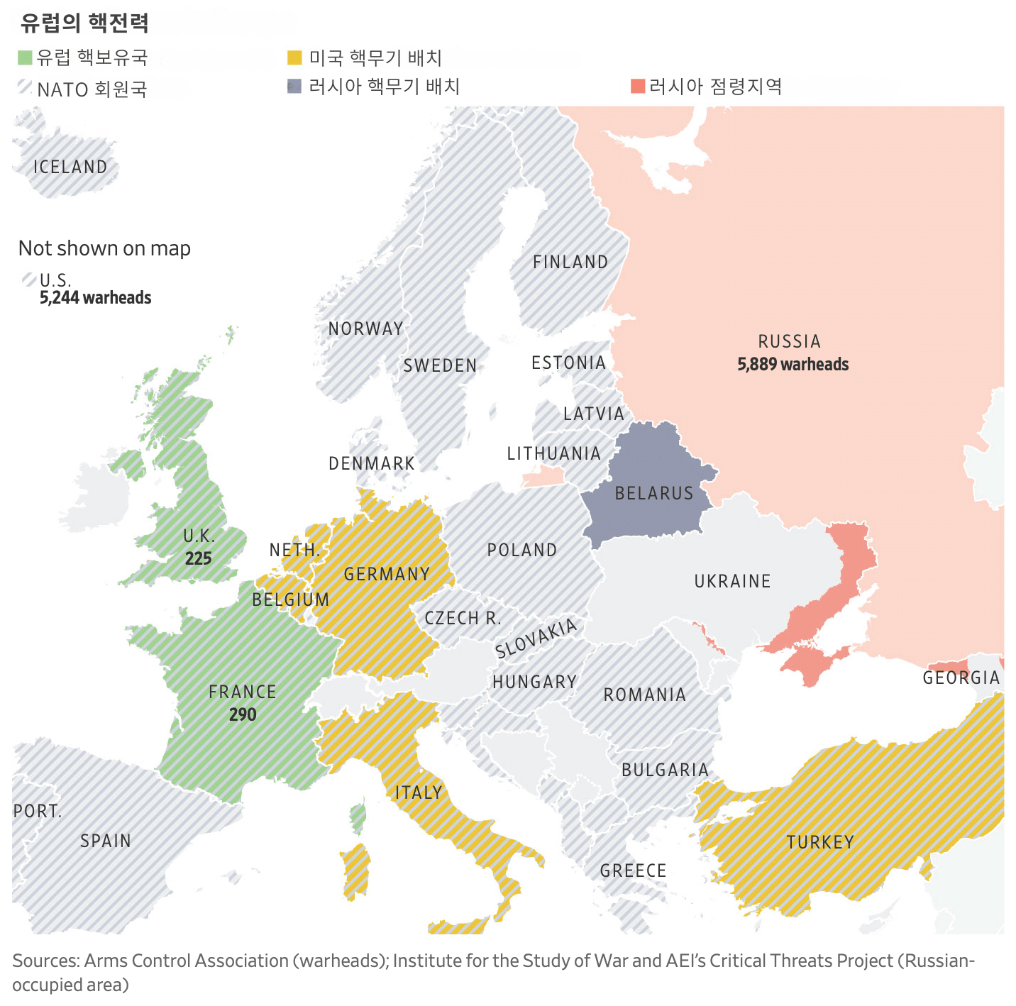 유럽에서 러시아를 억제하기 위한 핵 요소에 대해 어떻게 생각해야할지에 대한 예비논의는 한 가지 가장 중요한 것에 제약을 받고 있다. 어떤 나토 동맹국 정부도 나토 경계 내에서 평화를 유지하는 데 지금껏 매우 효과적이었던 미국 주도의 "핵 공유" 협정을 약화시킬 수 있는 어떠한 조치도 원하지 않는다는 점이 바로 그것이다. 미국은 '전략 핵무기'를 가지고 있을 뿐 아니라, 독일, 네덜란드, 벨기에, 이탈리아, 터키에 추가적인 '핵무기'(전술 핵무기)를 배치해왔다. 이들 국가의 조종사들은 핵무기를 통제하고 있는 미국이 공격을 승인할 경우 핵무기를 발사할 수 있는 (재래식 및 핵 공격이 가능한) 이중 용도 항공기를 조종하고 있다.