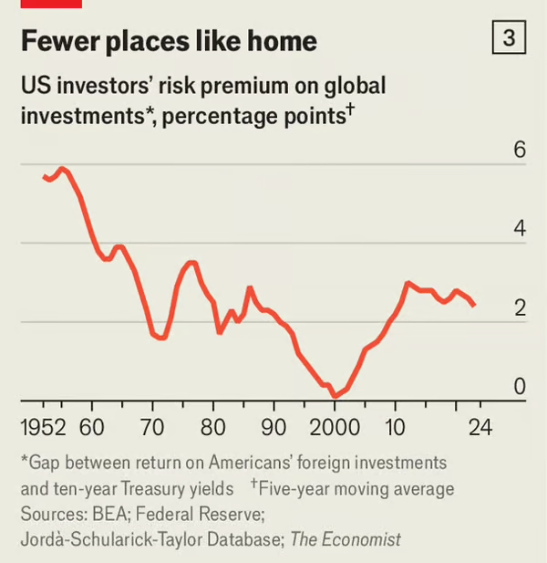 아직도 해외 투자에 나설 용의가 있는 투자자들은 더 높은 수익률을 기대한다. 이코노미스트는 연방준비제도이사회가 발표한 국경 간 투자의 유량flow과 저량stock에 관한 데이터를 분석했다. 몇 년 동안 미국 투자자들의 해외 수익률과 무위험 미국 국채 수익률 간의 격차가 줄어들고 있었는데 이는 세계가 더 안전해지고 있음을 시사한다. 그러나 최근 몇 년 사이 그 격차가 다시 벌어지면서 글로벌 불안정이 커지고 있음을 보여주고 있다(차트 3 참조).