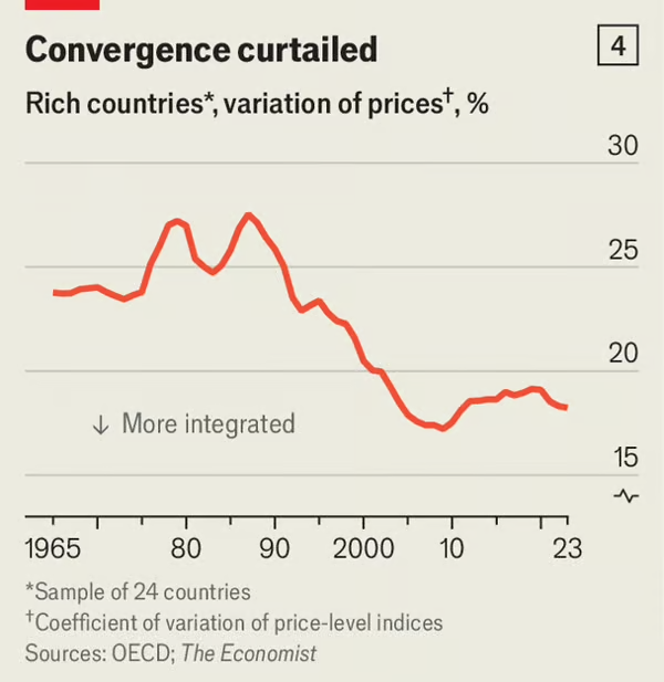 수년 동안 전 세계 상대가격의 차이는 감소하고 있었는데 이는 수렴 추세를 의미했다. 그러나 최근 몇 년 사이 진전이 멈추거나 심지어 역전되었다(차트 4 참조). 물론 경제학자들이 꿈꾸는 단일 세계 시장은 언제나 요원한 전망이었다. 일부 서비스는 거래하기 어려운데—로마의 변호사나 이발사가 오클랜드에서 고객을 유치하기란 어려울 것이다—이는 상대가격이 완전하게 수렴할 가능성은 별로 없다는 뜻이다. 그러나 전 세계적으로 차이가 벌어지고 있음은 세계 경제가 통합되기보다는 분열되고 있음을 시사한다.