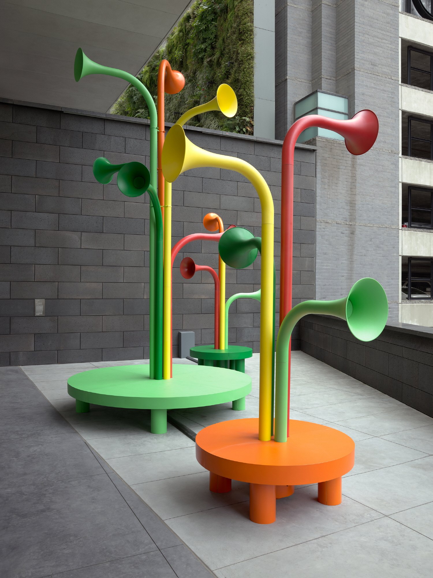 홀로 두드러져 보이는 작품이 하나 있다. 말 그대로 다른 작품들과 떨어져 미술관 이층 실외 난간에 설치된 작품이다. 높고 낮은 사무실 건물들이 뒤섞여있는 좁은 나토마 거리를 배경으로, 마치 몇 묶음의 나무들이 솟아 있는 것처럼 보인다. 가까이 다가가면 이 천연색 금속 튜브들이 스피커라는 걸 분명히 알 수 있다. 이들이 우리에게 말을 건다.