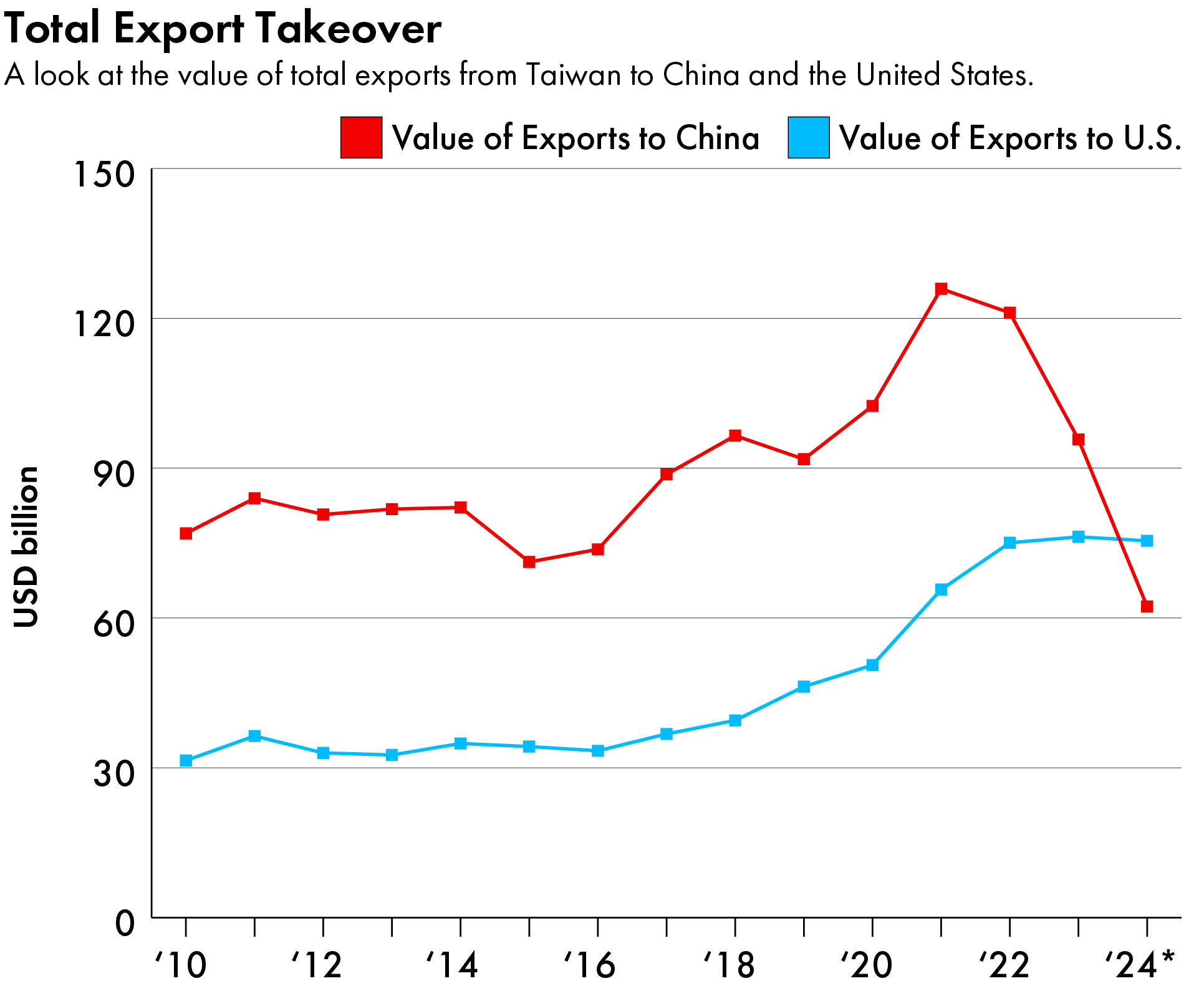 AI 칩과 서버의 급격한 성장으로 2018년 이후 대만의 대미 수출이 3배 이상 증가했다. 2024년 1분기 미국 시장 수출액은 250억 달러(33조7500억 원)에 달하는데 오랫동안 대만의 최대 교역 상대국이었던 중국에 대한 수출을 능가했다. 대만의 궈즈후이 경제부 장관은 AI 칩과 서버가 외국인 투자를 유치하고 중국의 공세를 막아냄으로써 향후 50년 동안 대만 경제의 성장을 지속할 수 있다고 말했다.