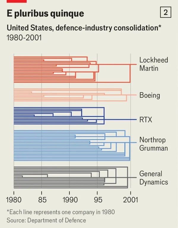 지난해 10월, 팔란티어의 최고기술책임자 샴 산카르는 '국방 개혁'이라는 4000자 분량의 선언문을 발표했다. 그는 1993년 51개였던 미국의 대형 방산업체가 현재 단 5개로 줄어들었다며(차트 2 참조), 이로 인해 혁신이 저해되었다고 지적했다. 산카르는 "방산업체들의 통합이 획일화를 낳았고, 혁신적인 창업가들과 엔지니어들을 내몰았다"고 비판했다. 이러한 변화는 단순히 기업 수의 감소를 넘어 방산업체들의 정체성과 기업 문화를 바꾸는 결과를 초래했다는 것이다. 트럼프 행정부에서 국방부 고위직을 제안받았으나 거절한 산카르는, 냉전 시대에는 미국 국방 예산의 단 6%만이 전문 방산업체로 흘러갔다는 점을 강조한다. 당시 대부분의 국방 계약은 민간 부문과 군사 부문을 함께 운영하는 기업들에 돌아갔다. 예를 들어, 그는 자동차 회사 포드가 1990년까지 인공위성을 제작했으며, 시리얼과 과자로 유명한 제너럴밀스가 대륙간탄도미사일의 유도 시스템을 개발했다는 점을 상기시킨다.