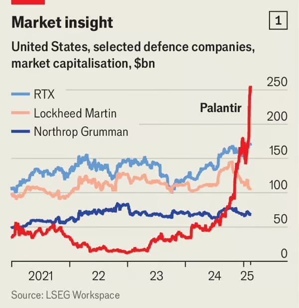 미국 정부는 이러한 변화에 큰 역할을 해왔다. 우크라이나군이 아프가니스탄과 이라크에서 사용된 것보다 더 성능이 뛰어나면서도 저렴한 드론을 개발하도록 지원했으며, 목표물을 식별하고 무기를 유도해 적의 후방 깊숙한 곳까지 타격하는 AI 기반 '킬 체인'을 구축하는 데 도움을 줬다. 미국 기업들도 이 새로운 전쟁 양상의 최전선에 서 있다. 이들은 정기적으로 우크라이나를 방문해 자사의 무기가 실제 전장에서 어떻게 작동하는지 관찰하고 이를 개선하고 있다. 또한, 전통적인 전쟁 방식을 혁신하려는 미국 기업들에 민간 자본이 몰려들고 있다. 지난해 12월, 데이터 분석 기업 팔란티어(Palantir)는 항공우주 기업 RTX(구 레이시언)를 제치고 세계에서 가장 가치 있는 방산업체 자리에 올라섰다. 2022년 러시아의 우크라이나 침공 당시만 해도 팔란티어의 시가총액은 RTX에 비해 미미한 수준이었지만, 현재는 그 격차를 크게 벌렸다(차트 참조).