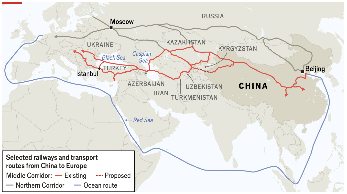 러시아를 통과하는 경로를 피하려는 화물 회사들은 '트랜스-카스피안trans-Caspian' 또는 남부 경로라고도 알려진 "중앙 회랑Middle Corridor"을 따라 카스피해의 카자흐스탄 항구로 경로를 바꿨다. 중국의 철도망을 키르기스스탄 및 우즈베키스탄의 철도망과 연결하면 유럽으로 가는 또 다른, 심지어 더 짧은 중앙 회랑 경로를 제공할 것이다. 2024년 6월에 중국은 이들 국가와 520km 길이의 노선을 추진하는 방법에 대한 합의에 도달했다.