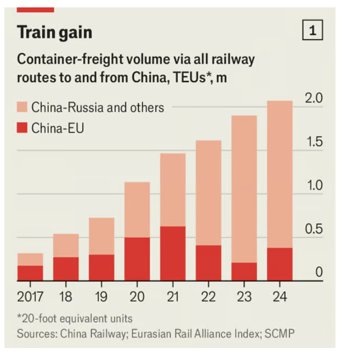 2024년 12월 키르기스스탄과 우즈베키스탄을 통과하여 러시아를 우회하면서 중국을 유럽과 더 긴밀하게 연결할 수십억 달러 규모의 철도 공사가 공식적으로 시작됐다(지도 참조). 트럼프 대통령의 무역전쟁이 미국 내 중국의 시장을 압박할 경우 이 연결은 중국에게 더욱 중요해질 수 있다. 중국은 이미 미국보다 유럽연합(EU)에 더 많이 물건을 팔고 있다. 우크라이나에서 홍해까지 펼쳐져 진행된 각종 위기들은 더 잘 연결된 글로벌 인프라를 확보하려는 중국 계획의 핵심에 타격을 주었고, 중국은 이제 무역 경로를 재구성해야 할 판이다. 이 철도가 예를 들어 대만을 둘러싼 미국과의 전쟁에서 도움이 될지는 더 의심스럽다.