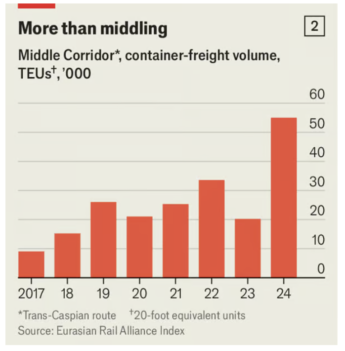 그러나 중앙 회랑은 여전히 "35% 더 비싸다"고 독일 물류 회사인 레누스의 이스탄불 관리 이사인 코르잔 투굴이 말했지만, 점점 더 많은 중국-유럽 물동량을 처리하고 있다. 카스피해에서의 항만 개선, 아제르바이잔과 터키 사이의 경로 업그레이드, 더 빠른 세관 절차가 이동시간을 38~53일에서 18~23일로 단축하는 데 도움을 주었다고 중국 학자들은 말한다. 그것은 여전히 러시아 관통 경로보다 길지만(모든 것이 순조롭게 진행될 경우 14일 미만) 이전보다 훨씬 더 경쟁력이 있다. 바다를 통한 여정은 약 한 달이 걸린다.
