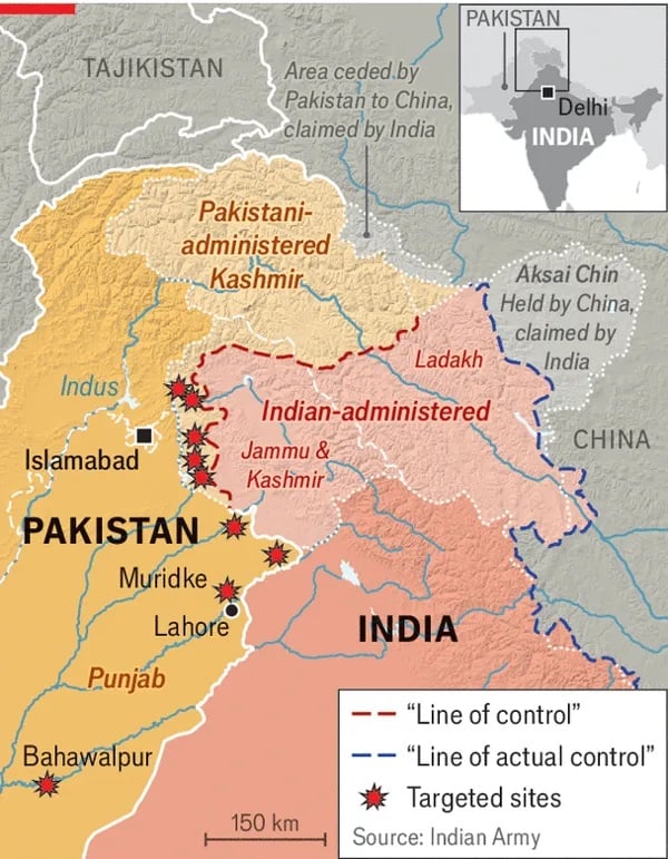 2019년과 마찬가지로, 인도는 파키스탄령 카슈미르뿐만 아니라 논란의 여지 없이 파키스탄의 영토인 곳도 공격했다. 이번 공습이 과거와 크게 다른 점은 파키스탄에서 가장 인구가 많고 정치적, 경제적으로 가장 중요한 주인 펀자브의 4개 지역을 목표로 삼았다는 것이다. 인도는 펀자브의 주도인 라호르Lahore에서 30km 떨어진 무리드케Muridke시의 목표물이 파키스탄 정보기관과 깊은 유대 관계를 맺고 있으며 인도 관리들이 최근 카슈미르 테러 공격의 배후라고 지목한 이슬람 무장단체 라슈카르 에 타이바(LET)의 훈련 캠프였다고 밝혔다. 인도는 펀자브 주 바하왈푸르Bahawalpur시의 목표물이 파키스탄 정보기관과 연계된 또 다른 지하드 단체인 자이쉬 에 무함마드의 본부였다고 말한다.