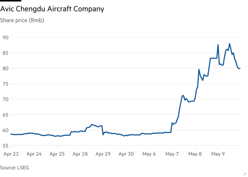 파키스탄 조종사가 최신형 비거러스 드래곤을 타고 인도의 프랑스제 라팔 전투기를 격추했을 수도 있다는 증거가 쌓이면서(아직 결론이 나오진 않았지만) 청두의 주가는 단 이틀 만에 40% 이상 급등했다.