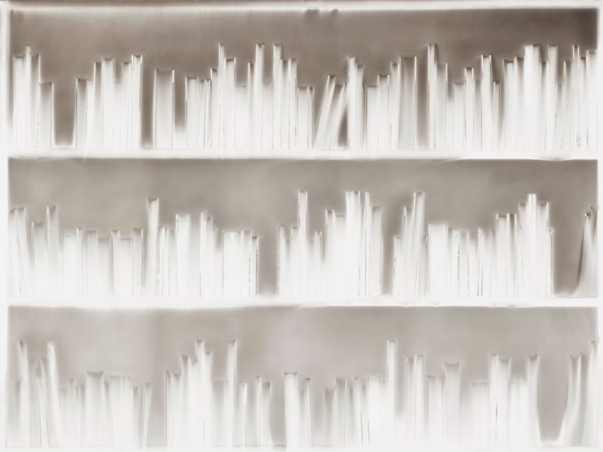 에스토릭컬렉션의 첫 번째 전시실에는 신기루처럼 보이는 두 점의 격자 형태 부조 작품이 마주보고 있다. 하나는 다양한 장식적 형태와 크기의 병과 꽃병들로—청소년 시절 파르미자니는 조르조 모란디의 조수로 일한 바 있다—, 다른 하나는 층층이 선반 위에 정렬된책들로 구성되어 있다. 이 작품들은 사라진 도서관과 소멸해가는 문명을 떠올리는 잔상들이다. 그 불타는 듯한 백색광 속에서 명암이뒤바뀐 음화(陰畫)같은 공간의 환영들 사이에 서 있는 것은 마치 자신이 감광지(感光紙) 사진 속으로 흡수되는 듯한 느낌을 준다.
