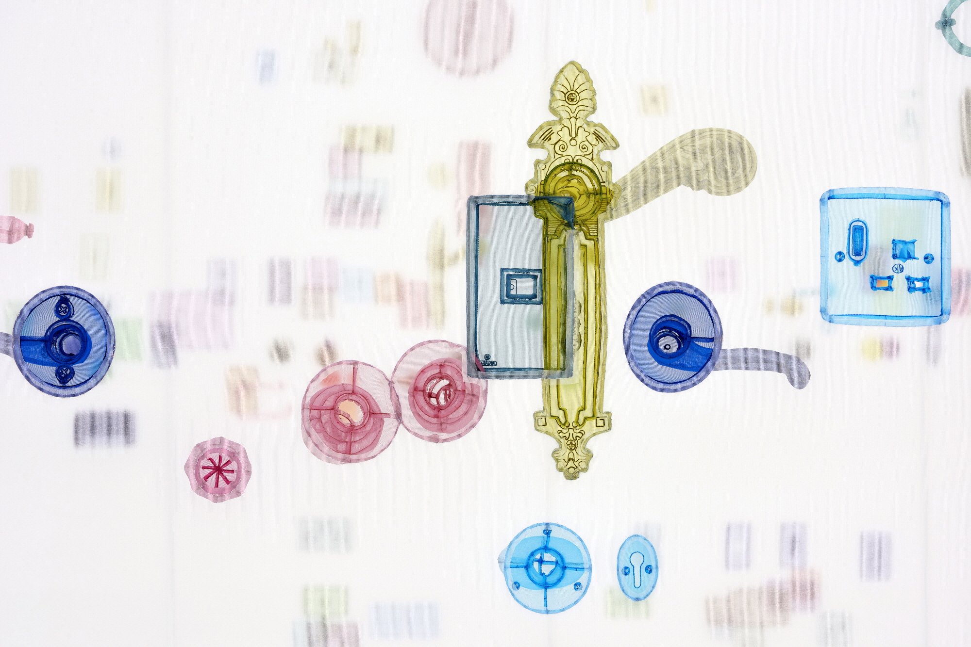 서로 다른 장소와 시간을 연결하는 이 과도기적 공간들은 하나의 연속된 통로를 형성하며, 그 가볍고 반투명한 재질은 의식의 흐름처럼 불안정한 기억 회상을 시각적으로 반영한다. 관람자는 그 안에 들어서면서, 꼼꼼히 봉제된 천으로 만들어진 환풍기, 늘어진 전선, 소화기, 한국화가 그려진 패널 등 섬뜩할 정도로 정밀한 재현물들을 마주하게 된다. 이와 대조적으로 <퍼펙트 홈Perfect Home>(2024)의 걸어 들어갈 수 있는 화이트 큐브는 미니멀리즘 작품이다. 그 내부는 서도호가 유랑하듯 살아온 삶의 기억을 따라, 각 장소에서 기억된 위치에 맞춰 조명 스위치, 문손잡이, 전기 플러그 등이 색상별로 바느질되어 있다.