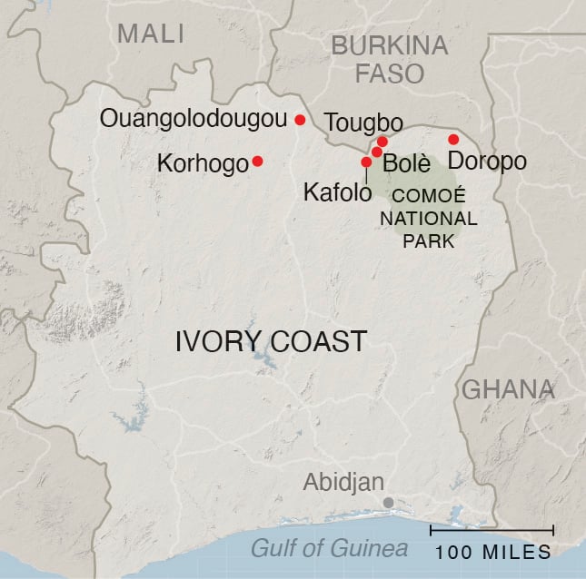 코트디부아르 북부의 작은 마을 투그보의 시장에는 말린 생선과 튀김 냄새가 가득했다. 시골에서 머리에 옥수수와 카사바를 이고 온 여성들이 분주히 물건을 팔았고, 아이들은 시장의 좁은 골목을 뛰어다녔다. 무슬림 원로들이 시장 모랫길 위의 사람들을 지켜봤고, 일요일 미사를 마친 기독교 신자들은 교회에서 쏟아져 나왔다.