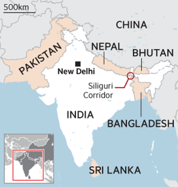 인도는 유누스 정부가 이슬람주의자들에게 너무 유화적이며 중국과의 친밀함이 전략적으로 중요한 인도 북동부 주들을 국경 긴장에 취약하게 만들 수 있다고 본다. 이 주들은 "닭모가지Chicken Neck"으로 불리는 좁은 실리구리 회랑Siliguri Corridor을 통해 인도의 나머지 지역과 연결된다.