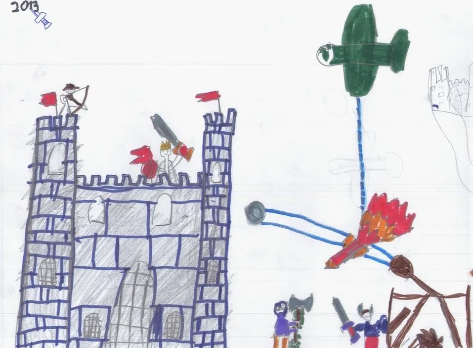 예를 들어 우리 하드웨어의 가장 유명한 '버그' 중 하나는 탄도 궤적을 예측하는 데 사용하는 '직관적 물리' 시스템에서 발생한다. 이 시스템은 야구공을 잡는 것 등에는 훌륭하지만 특정 사례에서는 잘못된 예측을 생성한다. 가장 잘 알려진 경우는 이미 움직이고 있는 물체가 떨어지는 상황을 고려할 때다. 우리의 직관적인 시스템은 그것이 똑바로 아래로 떨어질 것이라고 예측하지만 실제로는 전진 운동량을 보존하여 호를 그리며 하강할 것이다. 이 버그는 아이들의 그림에 자주 나타난다. 내 아들이 여덟 살쯤 그렸던, 다소 시대에 맞지 않는 공성전 그림이 그 예다.