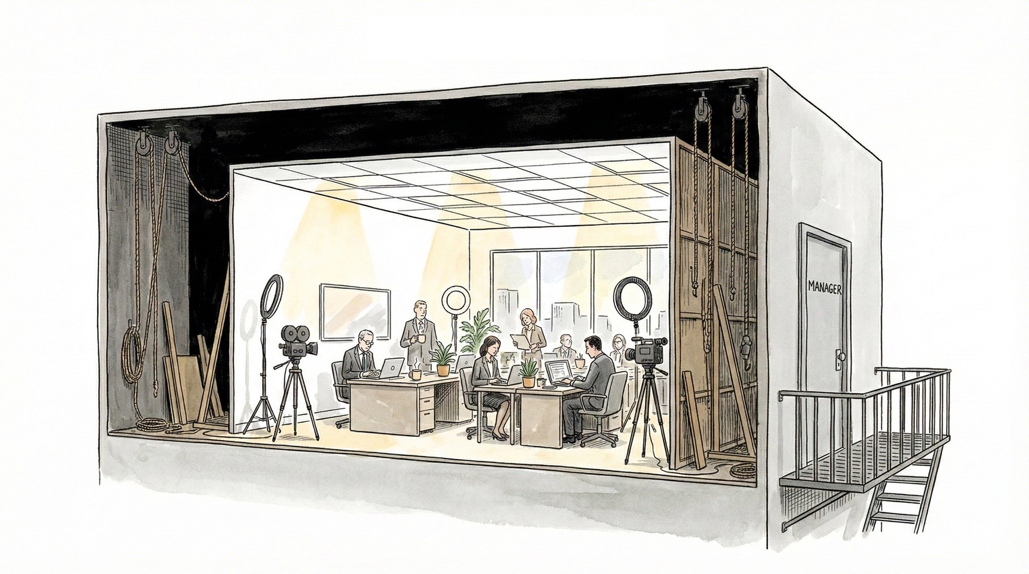 중국에 살면서 올해 중국어 인터넷에서 입소문을 탄 '가짜 출근pretending to work'에 대한 소셜미디어 게시물을 피할 수가 없었다. 이 유행은 2024년 12월 한 중국 버라이어티 쇼에서 개그 코너의 방영 후 시작되었다. 이 코너에서 한 사무자동화 기술자는 '가짜 출근'이라는 가상의 회사를 방문하는데 사람들은 돈을 내고 이곳 사무실에 와서 그저 시간만 때운다. 그들은 실제 업무를 하거나 월급을 받지는 않지만 고용된 것처럼 보이는 외양을 유지한다. 회사 대표는 일하는 시늉을 함으로써 실제 일자리가 생겼을 때 사람들이 자연스럽게 적응할 준비가 된다고 설명한다.
