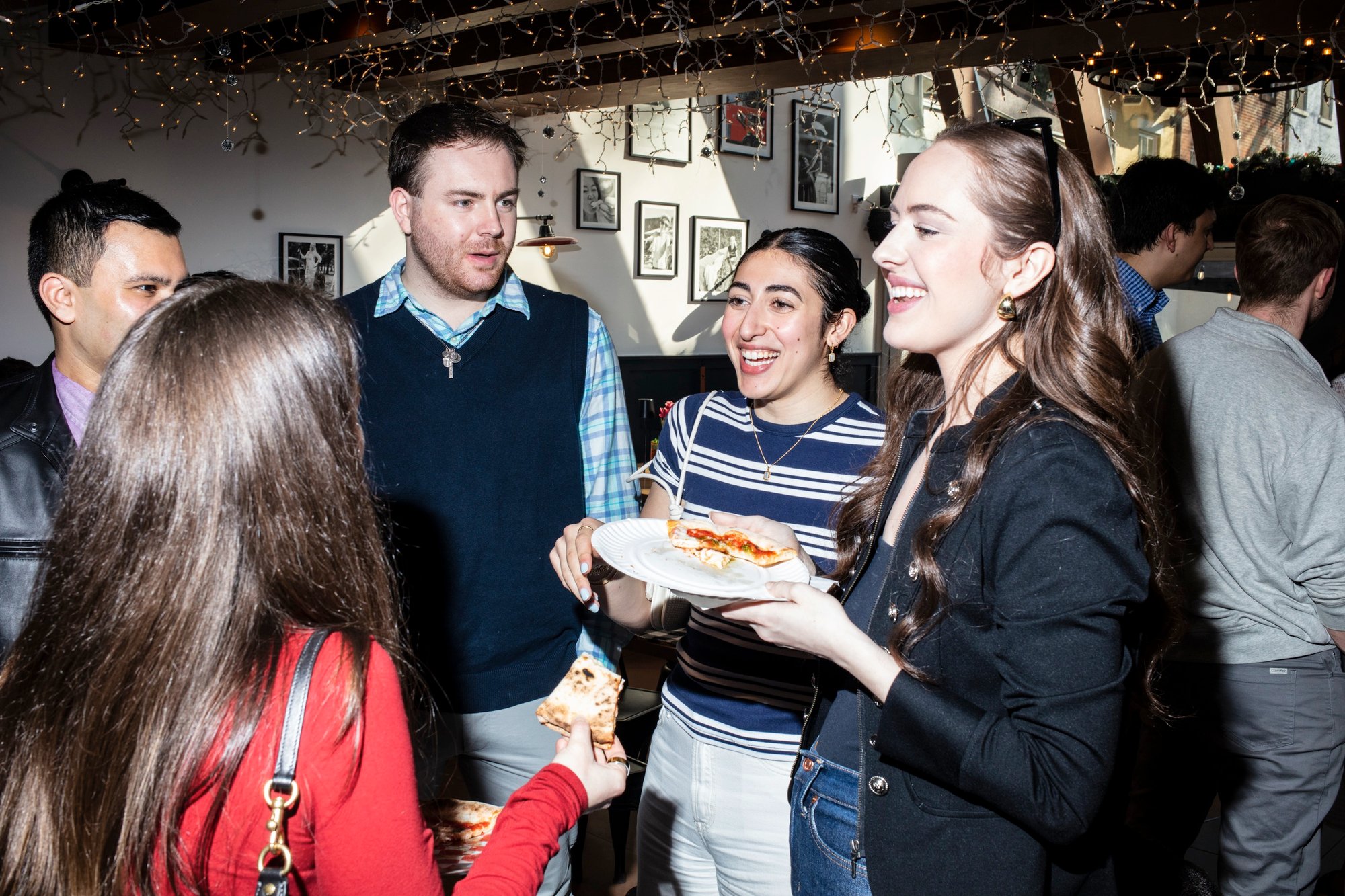 비즈니스 캐주얼 차림의 젊은 성인 약 100명이 피자 가게에 빽빽이 들어차 있었다.