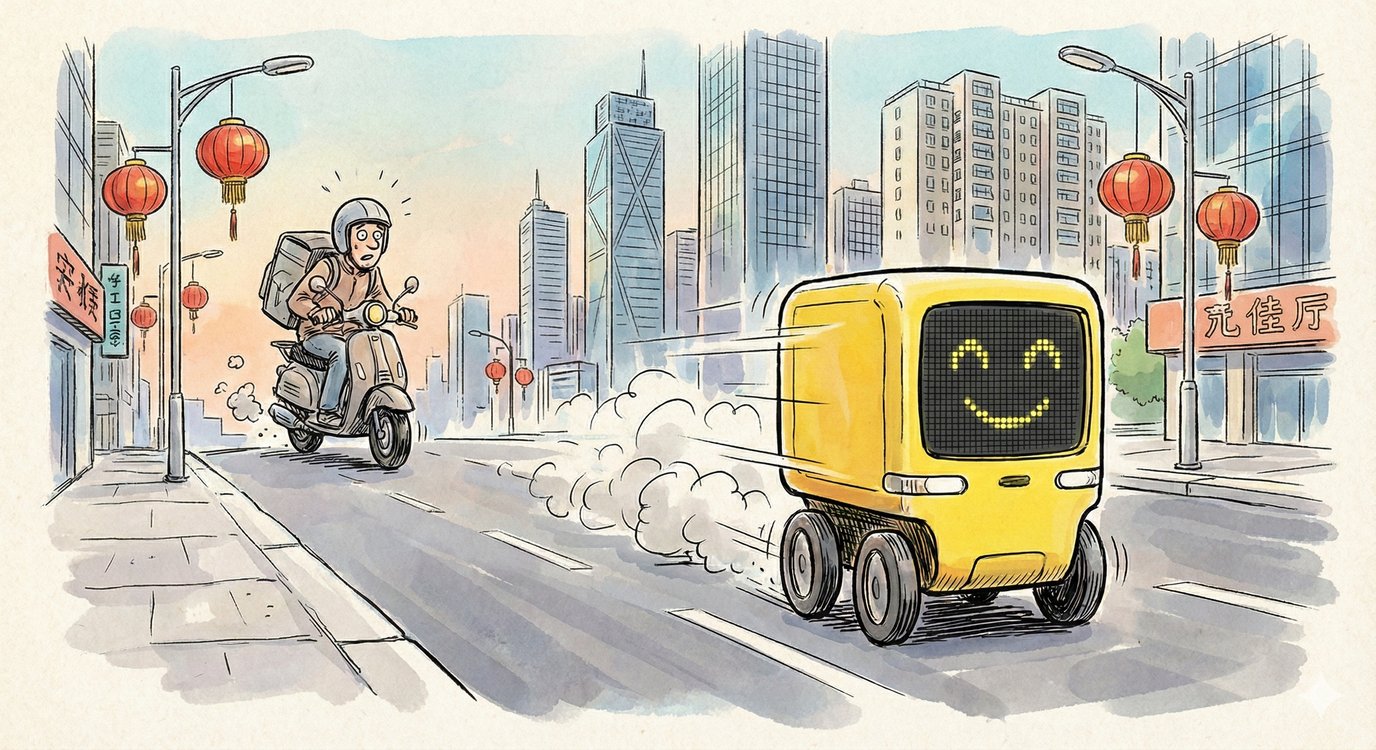 베이징 순이구 거리에서는 2020년부터 메이퇀Meituan의 땅딸막한 노란색 배송 로봇이 식료품과 포장 음식을 나르고 있다. 미니밴처럼 생긴 이 차량들은 보도의 경계석을 따라 천천히 이동하며 위로 열리는 두 개의 측면 문 안에는 주문 물품들이 가득 차 있다. 때때로 이 로봇들은 배달기사들과 협력하기도 한다. 로봇이 하차 지점에 도착하면 근처에 있던 기사가 문을 열고 물건을 꺼내 고객의 문 앞까지 달려간다.